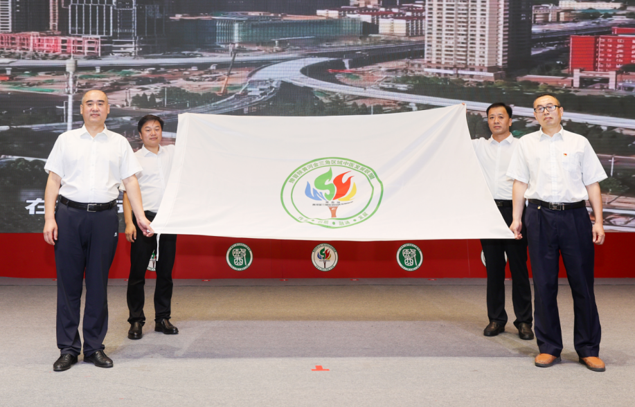 三门峡市中医院、运城市中医医院、临汾市中医医院、渭南市中医医院相关负责人共同签署了豫晋陕黄河金三角区域中医发展联盟章程同意书,并向参会代表展示了联盟会旗。