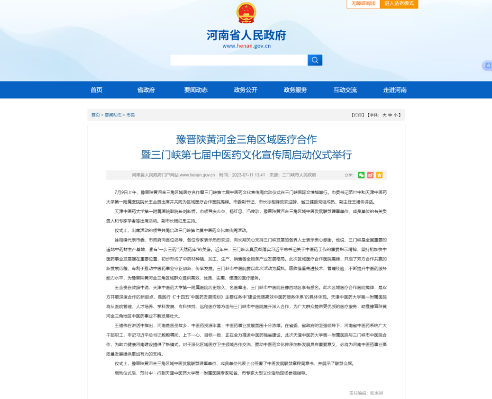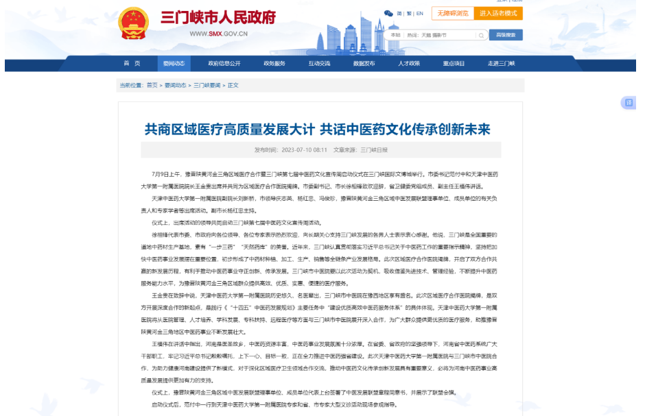 2023年7月,我院成功举办豫晋陕黄河金三角区域医疗合作暨三门峡第七届中医药文化宣传周活动,共包含有区域医疗合作揭牌、中医名家义诊、中医药特色表演与体验、各种关于中医药的学术论坛等环节,为广大市民带来了一场传播中医药文化、展示中医药魅力、传承中医药文化的根与魂、彰显时代价值的中医药文化盛宴。
