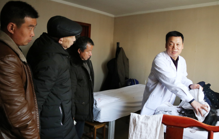 在全市村卫生室卫生人员培训班上,推拿科主任、主任医师杜世华为大家演示讲解推拿手法。