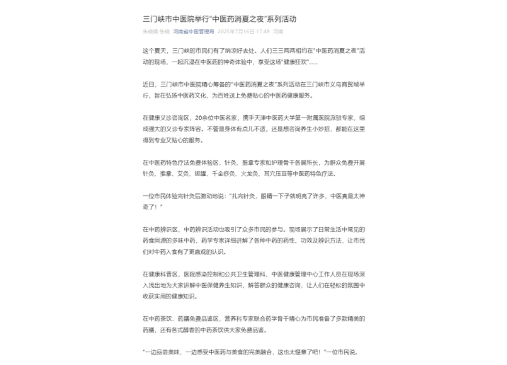 积极承办和参与大型中医药文化宣传及区域医疗合作活动,充分发挥我院在豫晋陕黄河金三角地区中医药传承创新中的引领作用。2023年以来,成功承办“豫晋陕黄河金三角区域医疗合作暨三门峡第七届中医药文化宣传周”“豫晋陕黄河金三角区域中医传承创新高质量发展大会”等重大活动,有效推动了区域中医药协同发展。作为河南省“西学中”培训基地,扎实开展“西学中”培训,助力基层医务人员提升中医药服务能力。同时,积极参与河南省“中医药文化服务月”和三门峡市“虢医健康行”等品牌活动,通过义诊咨询、中医适宜技术体验、中药辨识、药茶品鉴等群众喜闻乐见的形式,将优质中医药服务送到基层、惠及百姓,活动广受好评,并多次被省卫健委官网及主流媒体报道,社会影响力持续提升。