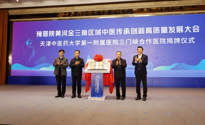 国医大师张伯礼、三门峡市市委书记徐相锋、天津中医一附院院长王金贵和河南省卫健委二级巡视员张健锋共同为天津中医药大学第一附属医院三门峡合作医院揭牌。