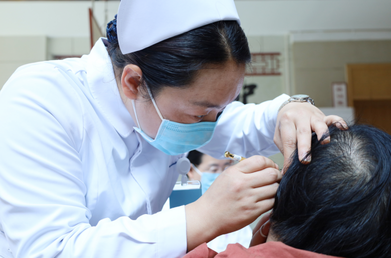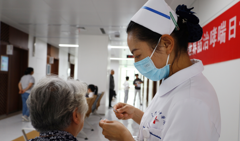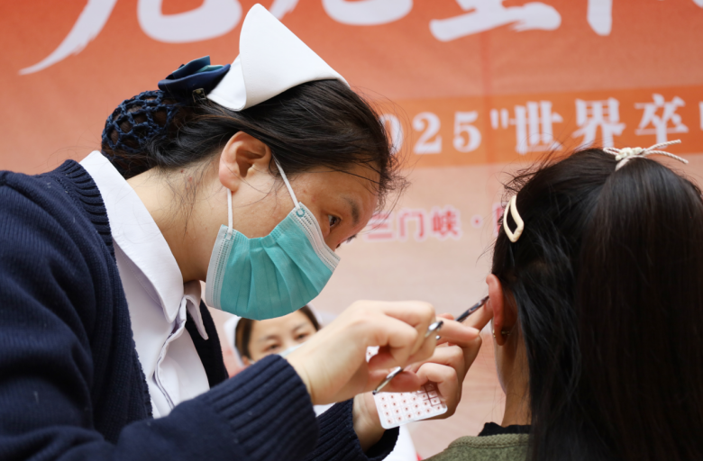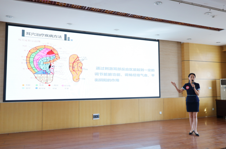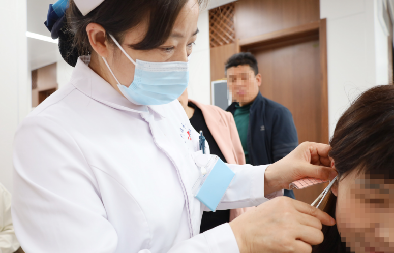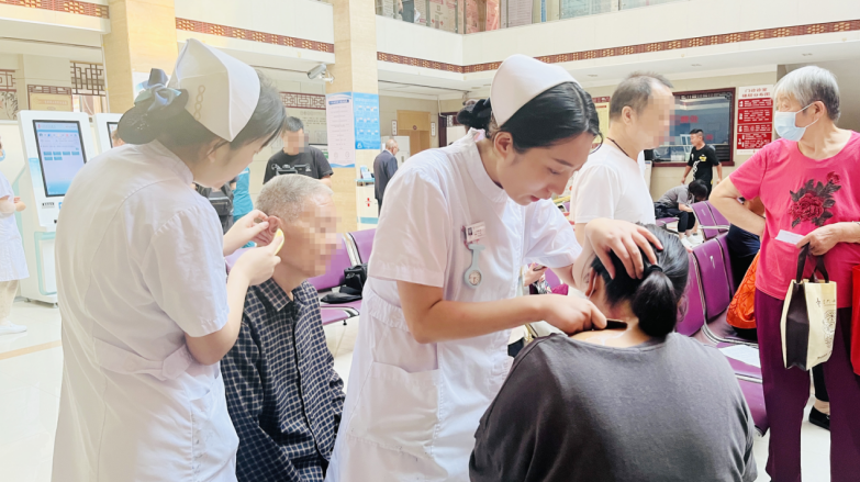肺病科副护士长曲晓萌为义诊群众进行中医特色疗法体验(耳穴压豆)。
