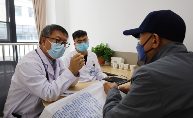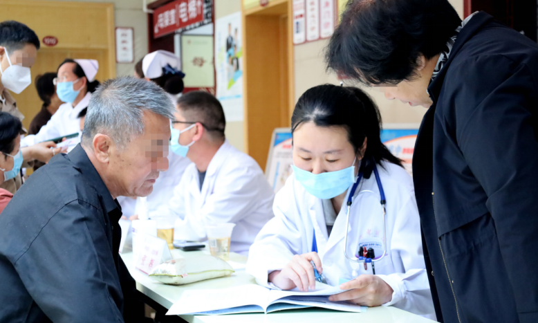 肿瘤科医师在义诊现场,为咨询的百姓解读报告,并通过望闻问切,辨证分析其体质,随后开具个性化的中药方剂和食疗建议。