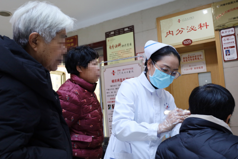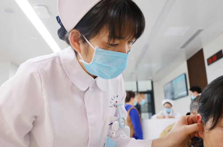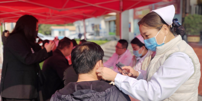 义诊现场内分泌科护理人员为百姓实施中医非药物疗法体验,通过贴压特定耳穴,来缓解改善糖尿病患者口干等部分临床症状。