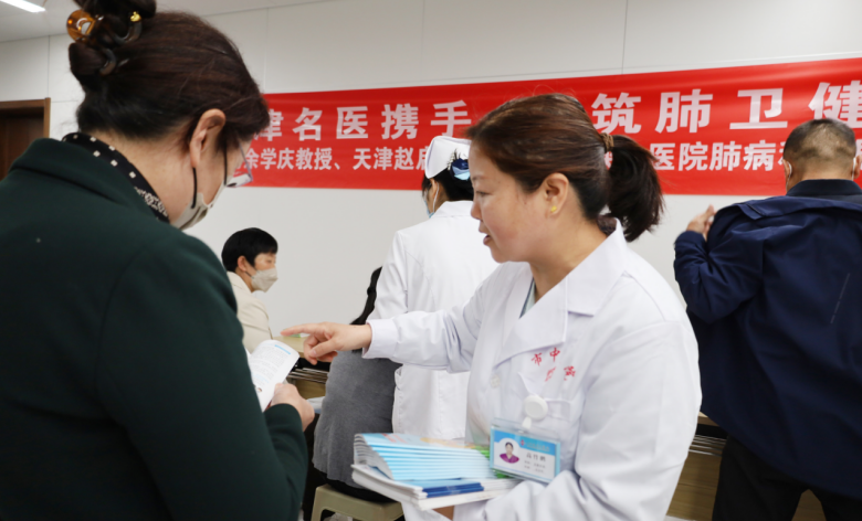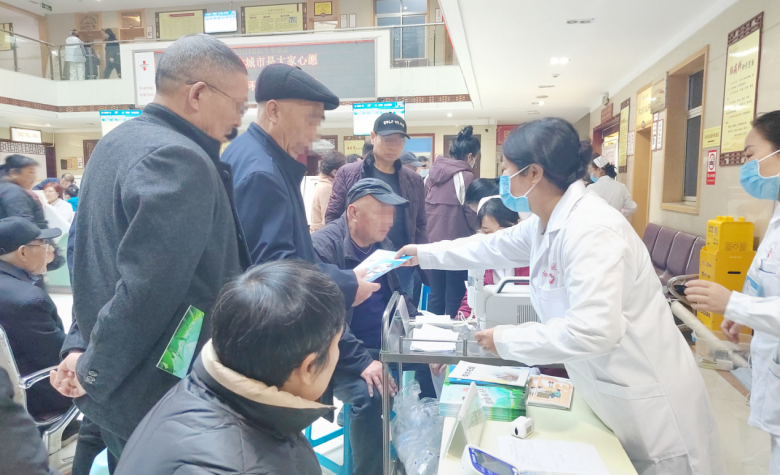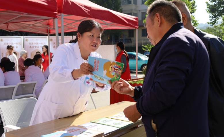 义诊活动中,医院感染与公共卫生管理人员高竹鹏为前来义诊的群众发放控烟、健康生活指导等科普资料。