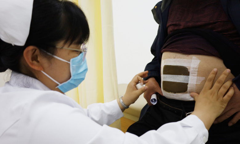 护理人员为义诊群众进行中医特色疗法体验(穴位贴敷)。