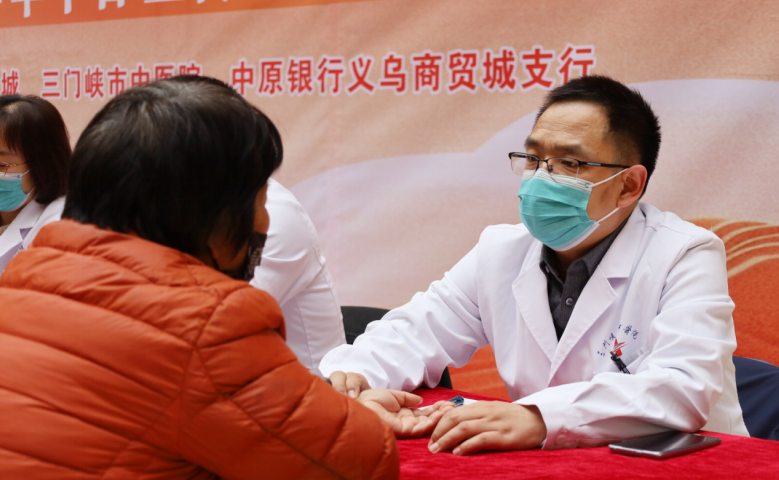 义诊现场,脾胃病科主任张伟萍为义诊群众把脉问诊。